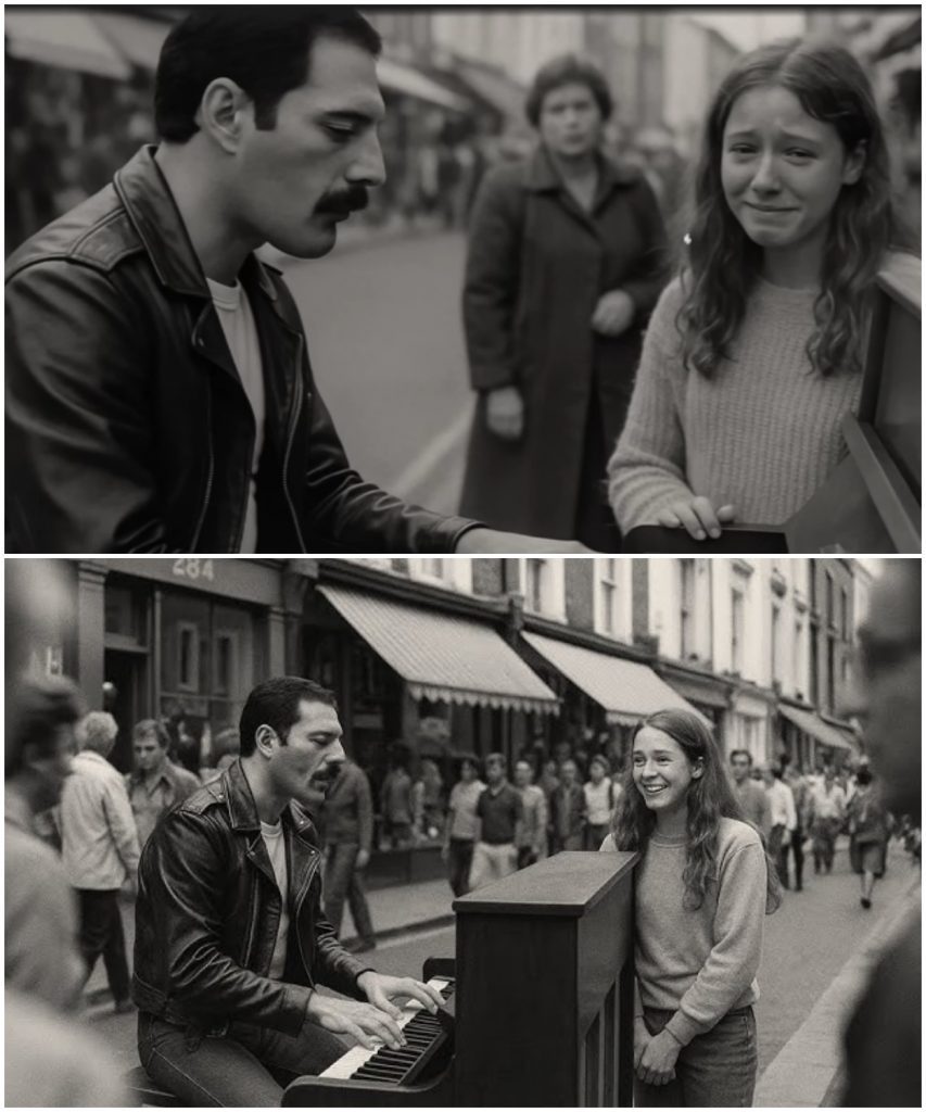 This man was none other than Freddie Mercury, the legendary frontman of Queen, known for his electrifying stage presence and his voice that had captivated millions. The crowd around Portobello Road quickly gathered, drawn in by the magnetic energy that radiated from Freddie. The girl, initially overwhelmed by the situation, watched in awe as a music legend effortlessly transformed her father’s piano into an instrument of magic.