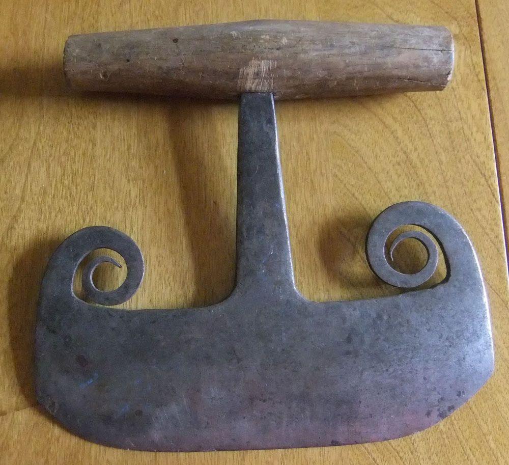 The object in question is called a mezzaluna knife (Italian for “half moon”), a centuries-old tool used for chopping herbs and vegetables. Its design is both simple and functional, with a curved blade that allows the user to rock the knife back and forth on a cutting board. This motion helps finely chop herbs, garlic, onions, or other ingredients, making it a staple in many traditional kitchens, especially in Northern Europe and America in the 18th and 19th centuries.