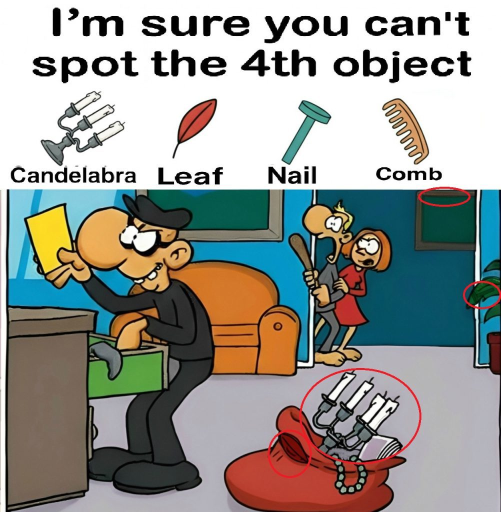 This final object is the reason the puzzle says, “I’m sure you can’t spot the 4th object.” Most people fail to find it, even after spotting the other three, because it’s camouflaged better than the rest.