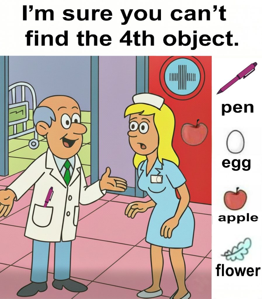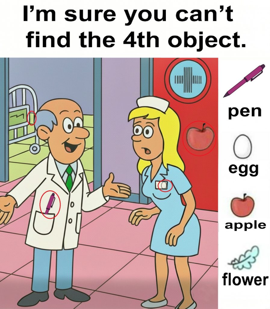 If you love brain-teasing puzzles that challenge your focus and attention to detail, this visual search puzzle is about to test your limits. At first glance, it looks like a simple cartoon scene: a doctor, a nurse, and a hospital hallway. But hidden within this colorful illustration are four tiny objects that almost no one spots on the first try. Your mission is to find a pen, an egg, an apple, and a flower. Sounds easy, right? Don’t be so sure. Most people miss at least one object, even after carefully scanning the image several times.