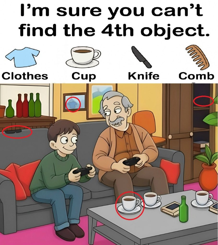 Brain–teasing picture riddles are a fun way to slow down, sharpen your focus, and test how observant you really are. In this puzzle, we see a cozy living room scene: a boy and his grandfather are happily playing video games on the couch, surrounded by bottles, plants, books, and cups of coffee. Somewhere inside this peaceful moment, four hidden objects are waiting to be found: clothes, a cup, a knife, and a comb.