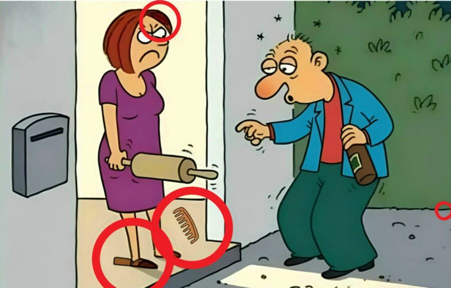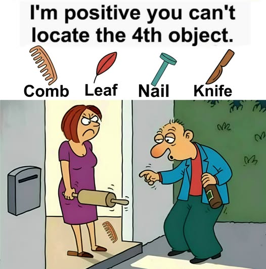 The image features a quirky scene: A woman holding a rolling pin, standing at the door, looking annoyed. The man outside seems a bit tipsy, holding a bottle in his hand. Hidden in this image are four objects — a comb, a leaf, a nail, and a knife. Your task is to find these items in the scene. Think you can do it? Keep your eyes sharp and your mind focused!