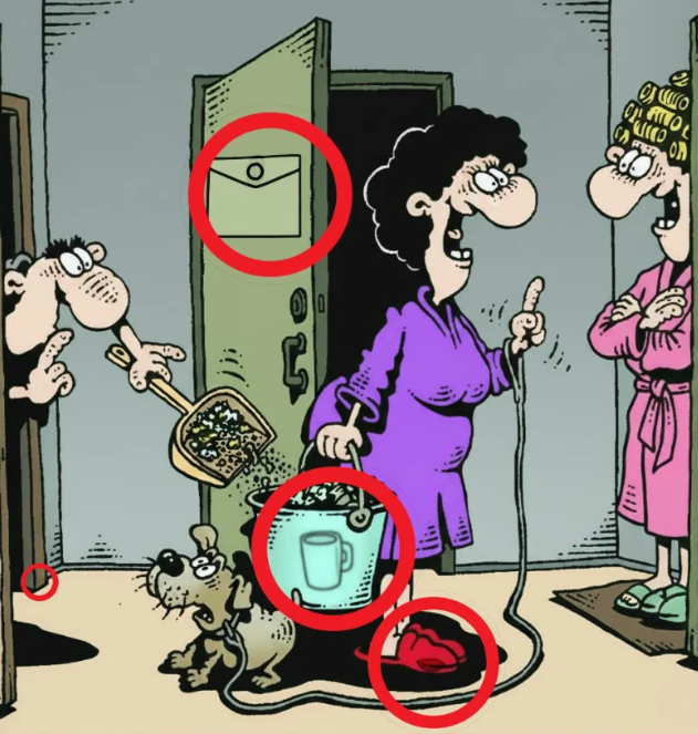 Finally, sweep the floor again—this time question “obvious” items. Near the woman’s feet you’ll see a bright red, rounded shape. Your brain may label it as a slipper at first glance because it sits by footwear. But the contour and shine say otherwise. That red object is the apple, tucked beneath the woman’s foot, partly occluded by the vacuum hose. Re-frame it from “shoe” to “fruit,” and the highlight and curve suddenly make perfect sense.