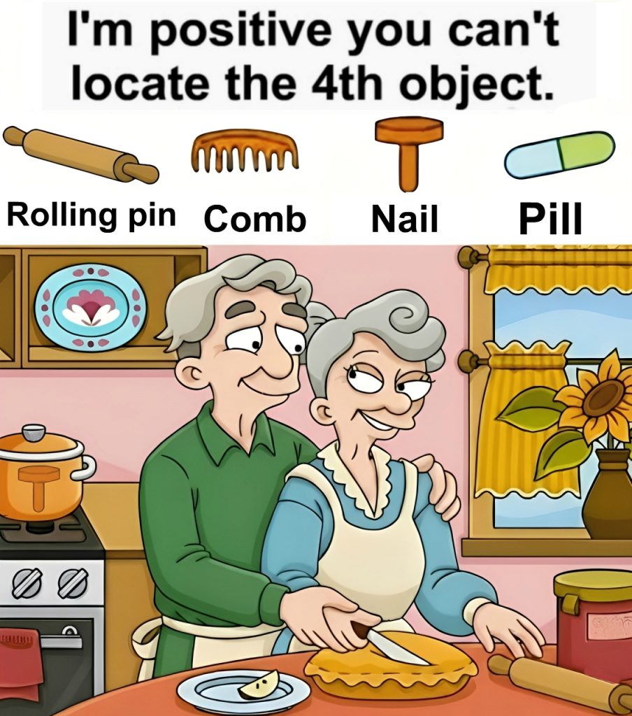 Which item did you spot first? The bold rolling pin on the tabletop, or the sneaky pill peeking from under the curtain? How long did it take you to complete all four? Drop your time, your order of finds, and your favorite trick in the comments. If you noticed a different tell (like a reflection or a wrinkle giving something away), share it—your tip could be someone else’s “aha!” moment.