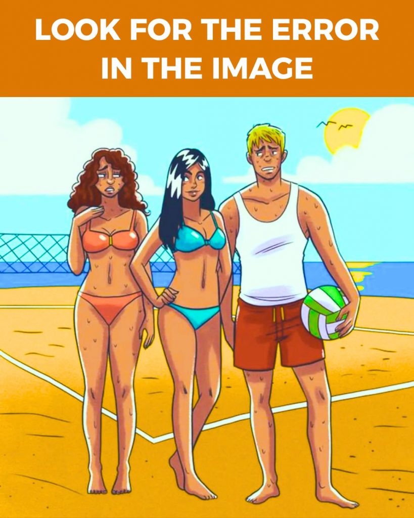 So take a deep breath, zoom in if you need to, and give yourself ten seconds. Who among the three — the red bikini woman, the man with the volleyball, or the woman in the blue bikini — seems a little off?