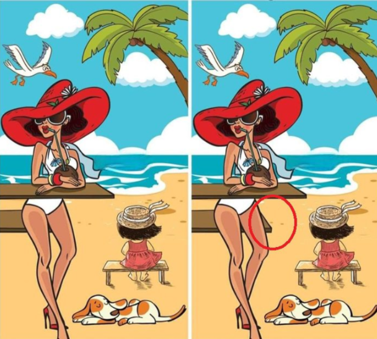 Are you ready for a quick brain workout? Here’s a visual puzzle that’s been making waves online — and only the most observant people can solve it in under 30 seconds! At first glance, these two sunny beach scenes look exactly the same: a glamorous woman in a red hat sipping her drink, a little girl sitting on a bench, a dog napping in the sand, and a seagull soaring above the palm trees. But somewhere in these nearly identical images hides one subtle difference that’s easy to miss.