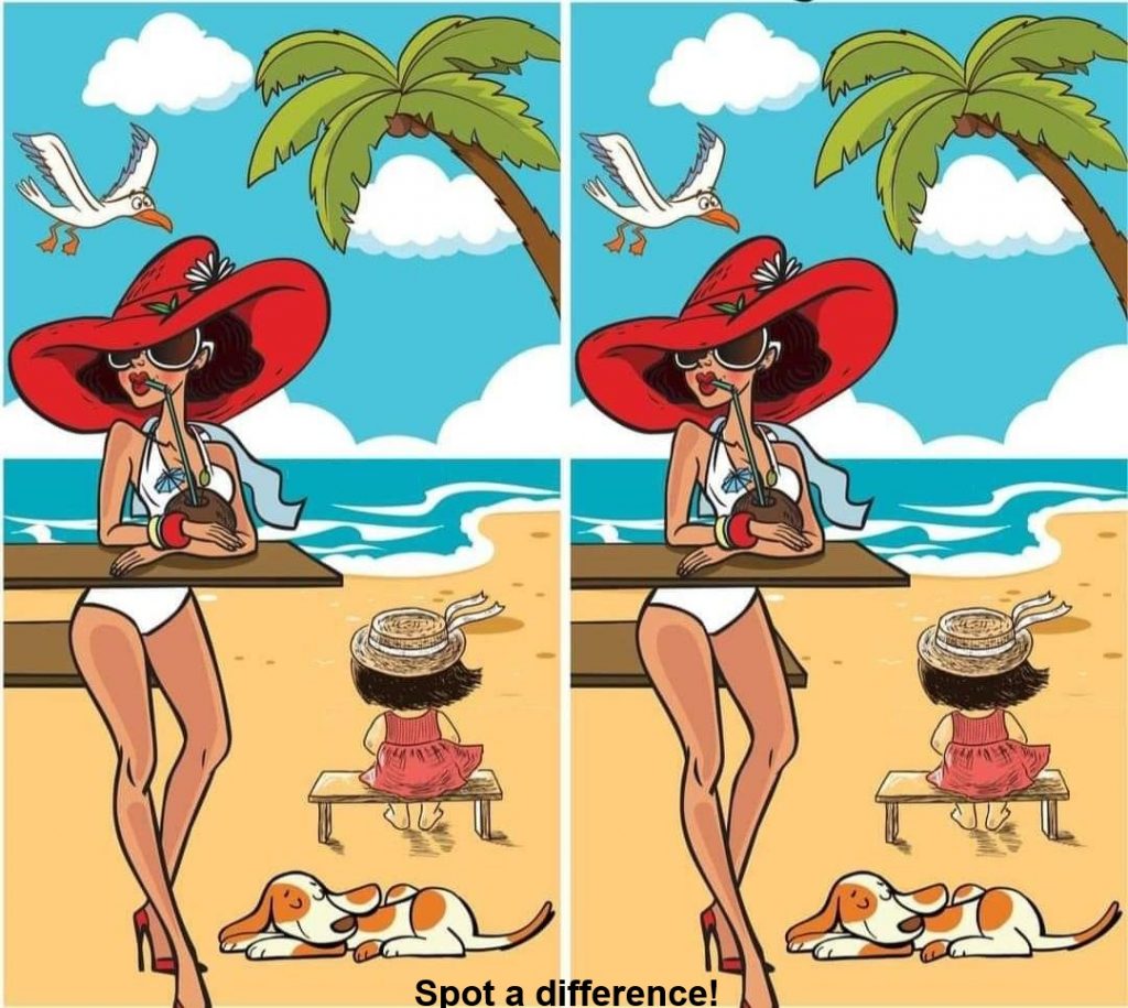 Are you ready for a quick brain workout? Here’s a visual puzzle that’s been making waves online — and only the most observant people can solve it in under 30 seconds! At first glance, these two sunny beach scenes look exactly the same: a glamorous woman in a red hat sipping her drink, a little girl sitting on a bench, a dog napping in the sand, and a seagull soaring above the palm trees. But somewhere in these nearly identical images hides one subtle difference that’s easy to miss.