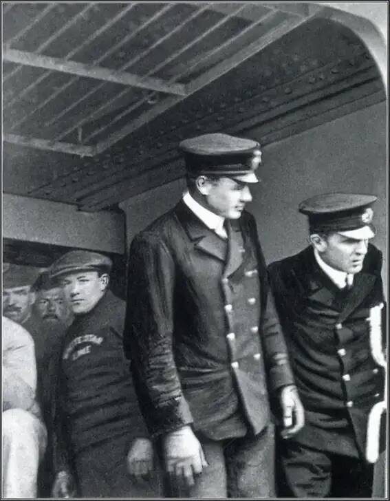 This iconic image shows Second Officer Charles Lightoller and First Officer William Murdoch aboard the Titanic just before it struck an iceberg on April 14, 1912. While Lightoller survived the disaster, Murdoch tragically perished, cementing this photo as a haunting reminder of the fateful event.