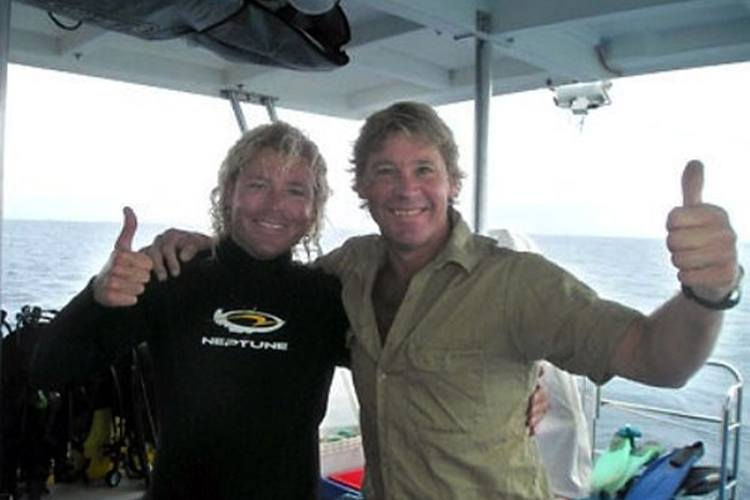 Captured shortly before his tragic death on September 4, 2006, this photograph of Steve Irwin, the Crocodile Hunter, shows him with marine biologist Chris Jones on his boat. Irwin was fatally attacked by a stingray while filming for a documentary, leaving fans devastated worldwide.