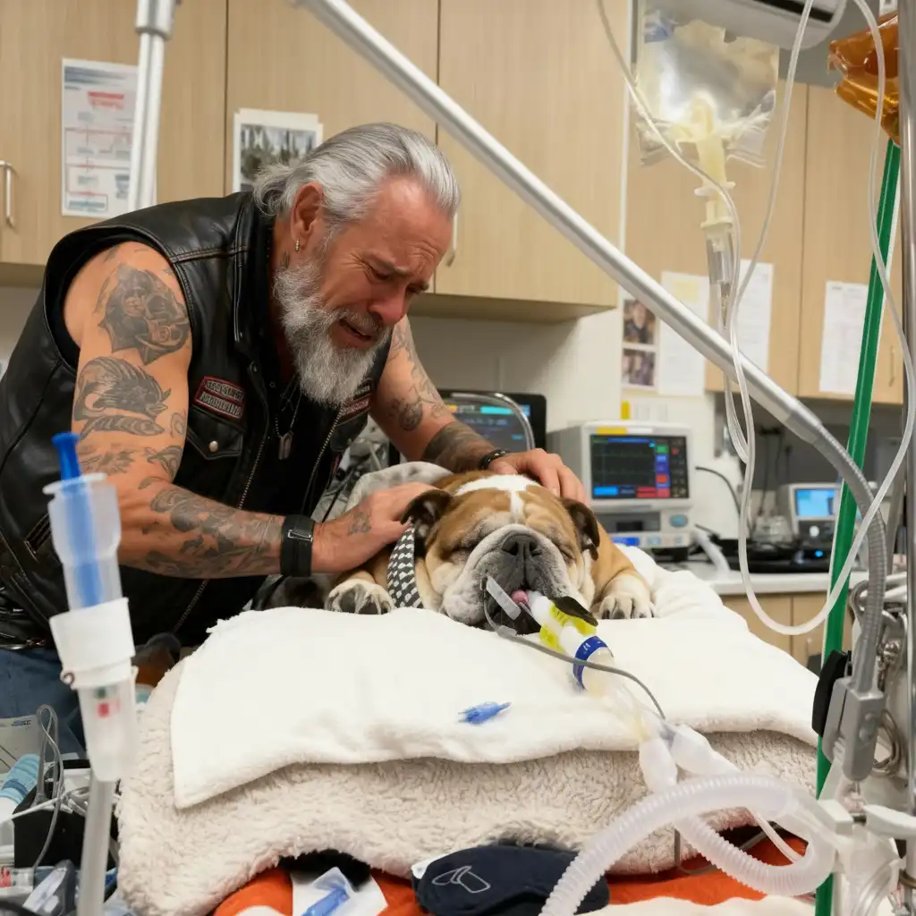 For forty-five minutes, we treated that bulldog like a person. IV line. Fluids. Ultrasound. Pain meds. We stitched his wounds and fought the clock. The biker stood silently in the corner, whispering prayers under his breath. When Dr. Chen finally said, “He’s stable,” the man let out a sob that echoed through the room.