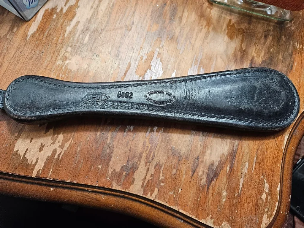 Run your finger along the worn leather, and you can almost imagine the many hands that held it. The cracked edges, the softened stitching, and the faded manufacturer stamps are more than signs of age—they are signs of life. Tools like this saw long nights, long shifts, and countless moments, yet they endured.