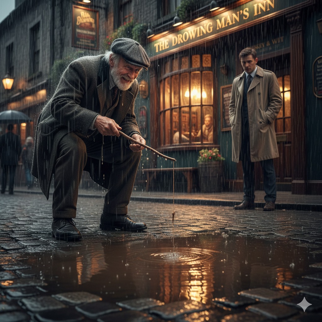Rain was pouring down in sheets one gray afternoon. Outside a cozy Irish pub, an old man stood hunched over a large puddle, drenched from head to toe. He held a stick with a piece of string dangling into the water, concentrating hard.