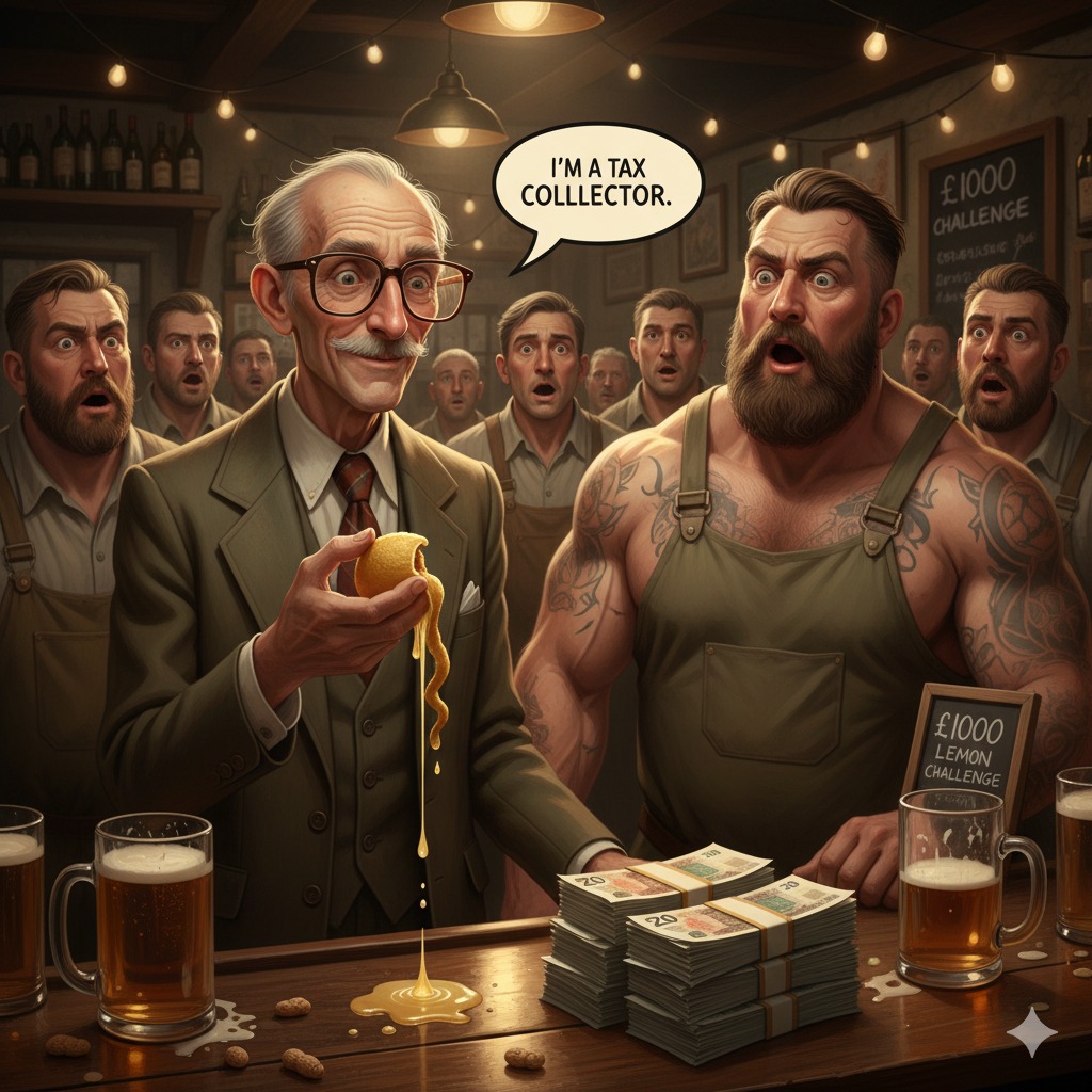 There was a bar in a small town with a famous tradition: the bartender was known as the strongest man around, and they ran a standing challenge with a cash prize of £1000.