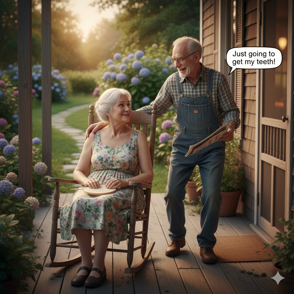 An elderly couple sat on their porch, rocking gently. Her hands were busy with embroidery, while he was buried in the morning paper.
