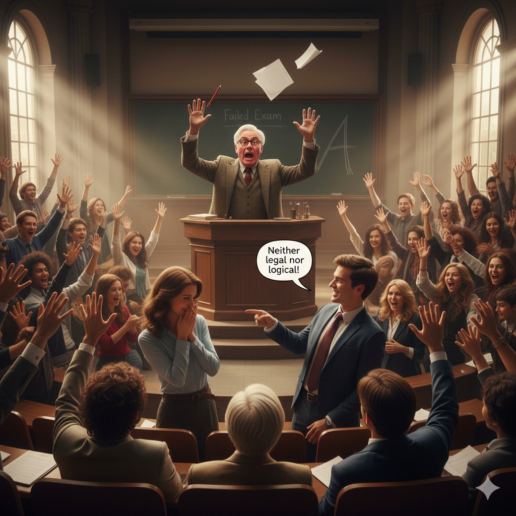 Student: “Sir… you’re 65 and married to a 28-year-old. Legal but not logical. Your wife is having an affair with a 23-year-old man. Logical but illegal. And… you just gave the man an ‘A’ after he failed. That’s neither logical nor legal!”